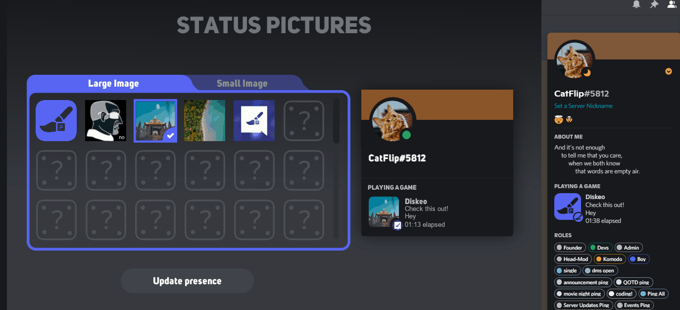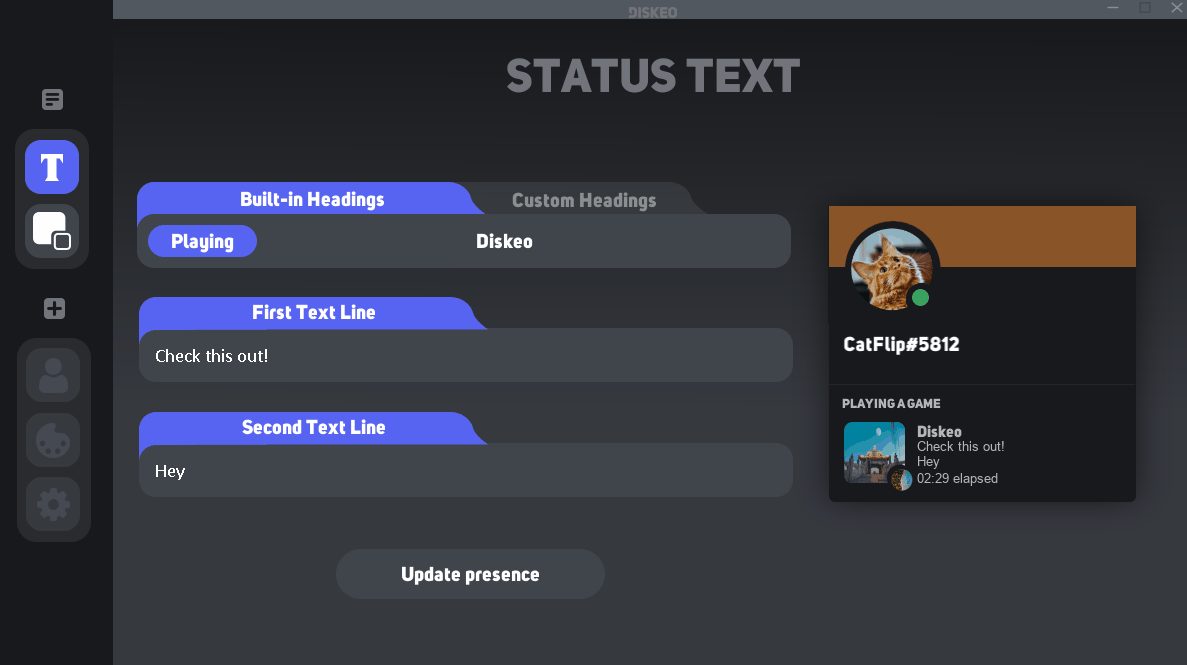 Tags | custom, customization, discord, diskeo, maker, presence, rich, status |